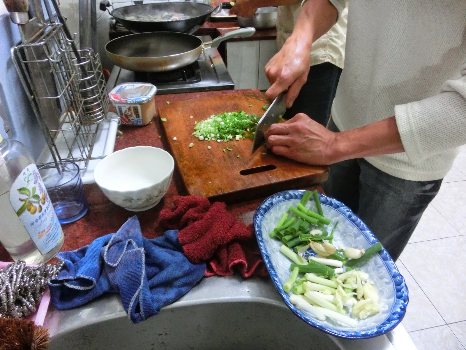 我拿台東長濱的鬼頭刀魚乾讓阿華料理,阿華先用米酒灑在切塊的魚乾上後晾一會兒,然後用蔥段與些許辣椒熱炒。